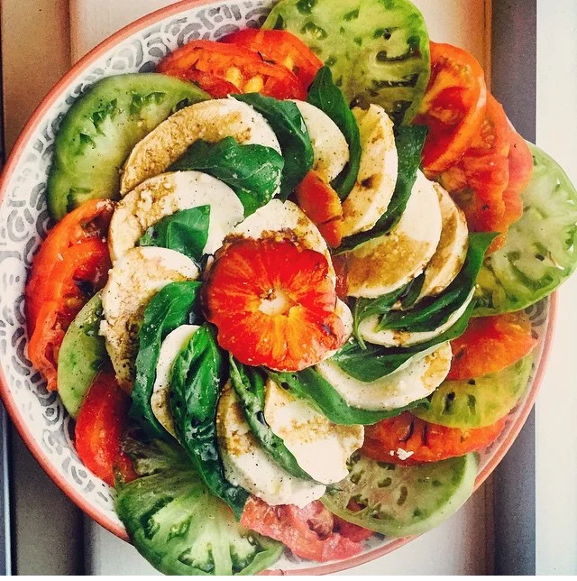 Slice tomatoes and mozzarella into 1/4 inch thick pieces. Get creative with how you arrange the tomatoes and cheese, you can alternate tomato colors, insert cheese slices and add the basil as you wish. I alternated the tomato slices then the cheese and the basil. The tomatoes were truly sweet like candy and fresh made mozzarella melted in our mouths, I need to make this again immediately.