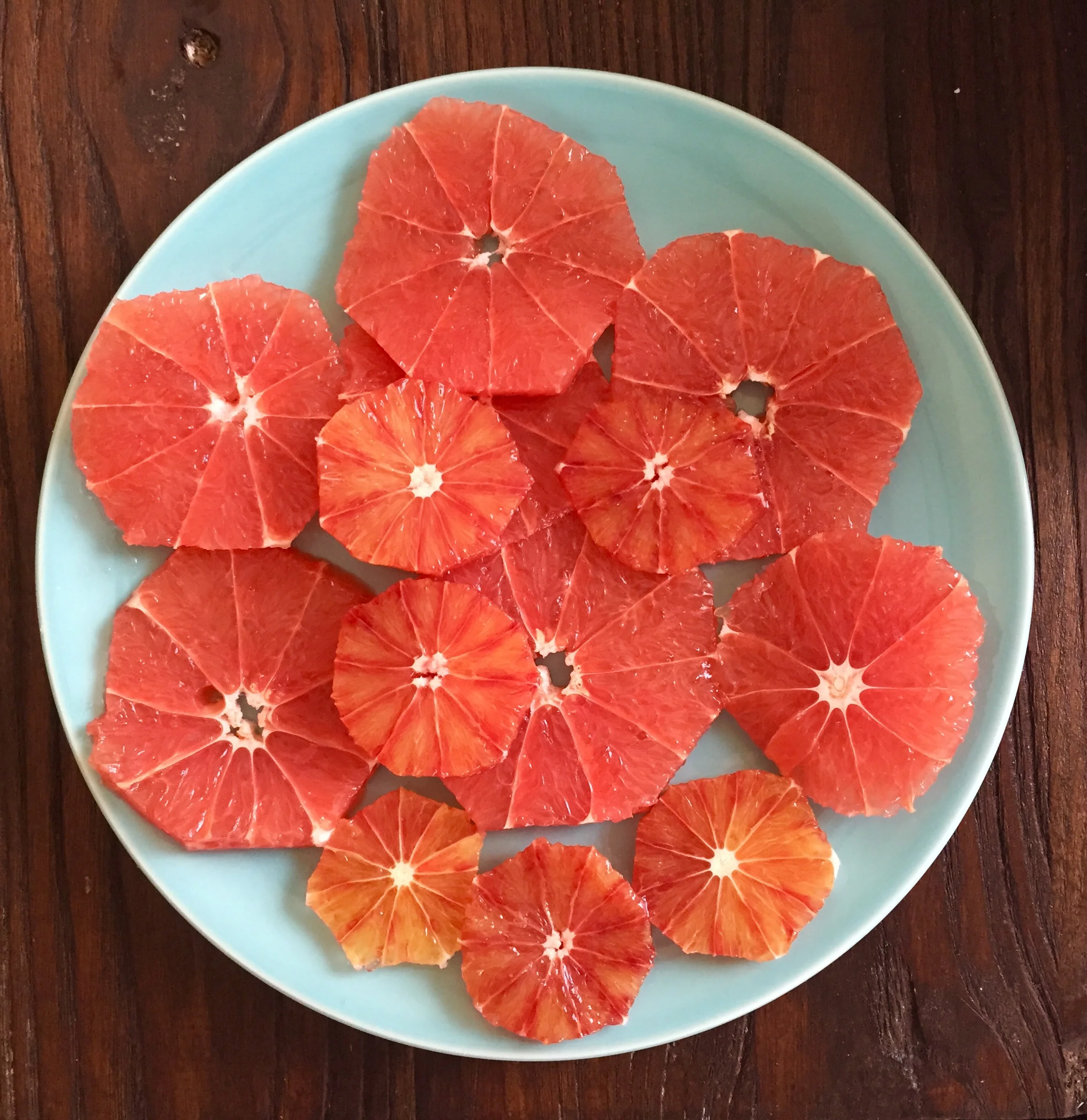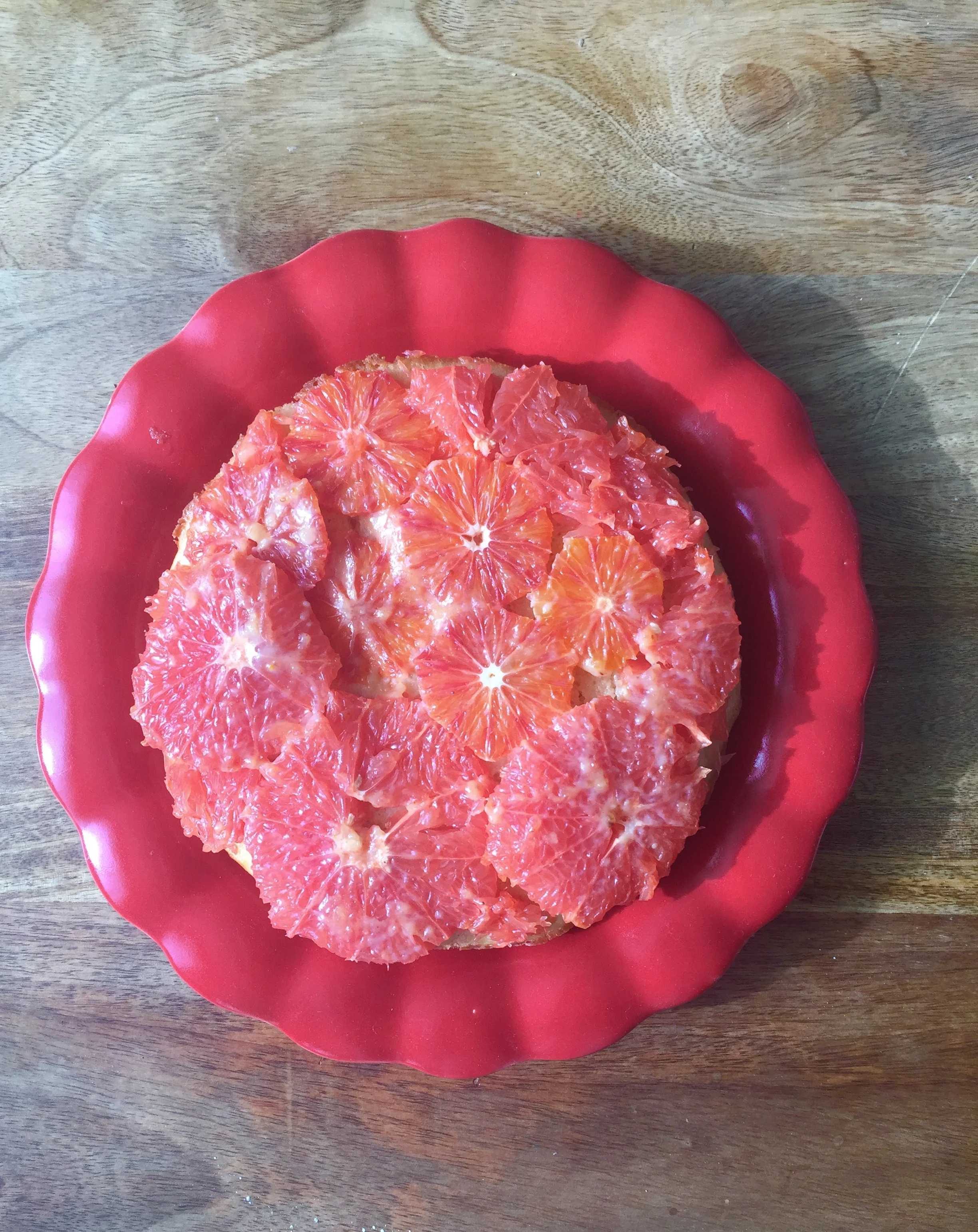 Make the cake the same but do not make the syrup. You will 2-3 oranges/grapefruits. One grapefruit and one blood orange is what I used. You will need to cut off either end of the fruits then trim closely along the sides of the fruit to remove the peel. You will do this a total of 5 times around, creating a hexagon shape. Be sure to stay close to peel and not take too much of the flesh away. Next turn the citrus on its side and cut 1/8 inch thick slice.